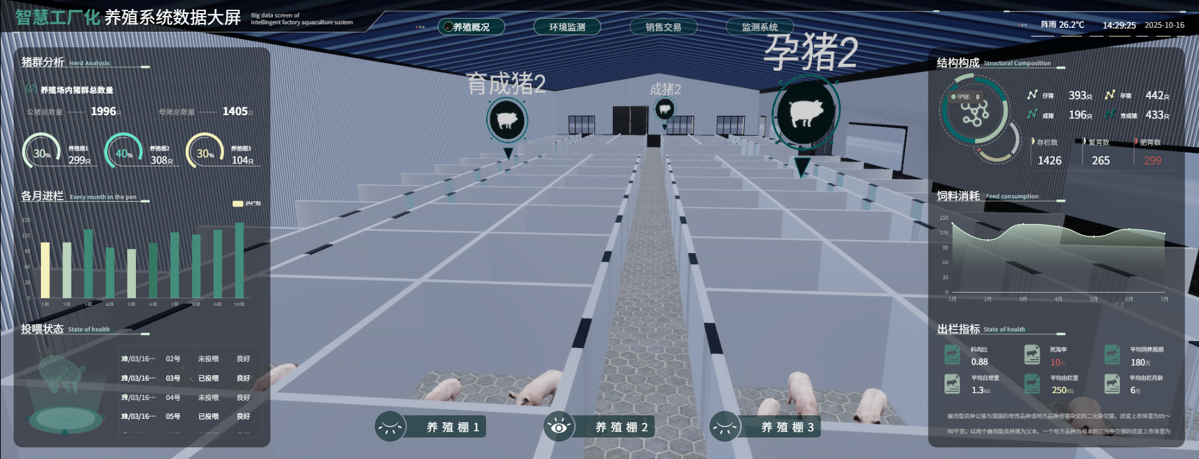 以 16:9 标准大屏尺寸呈现,数据展示逻辑清晰,兼顾全局态势与局部细节,助力快速掌握养殖全流程状态。