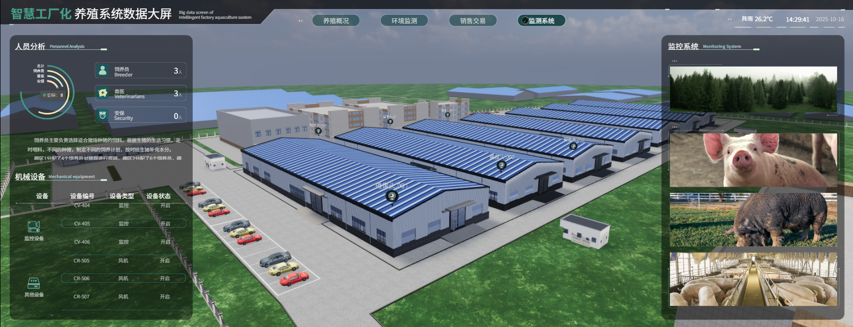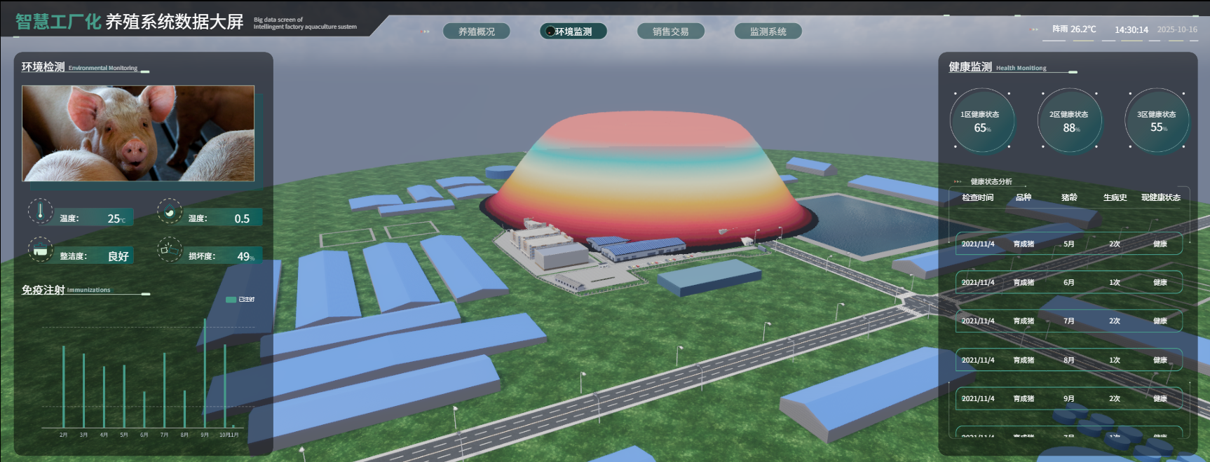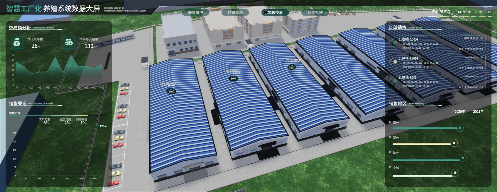 覆盖养殖情况、环境监测、销售交易、监测系统四大核心模块,运用柱状图、折线图、热力图等多元组件,搭配 3D 模型直观展现数据。