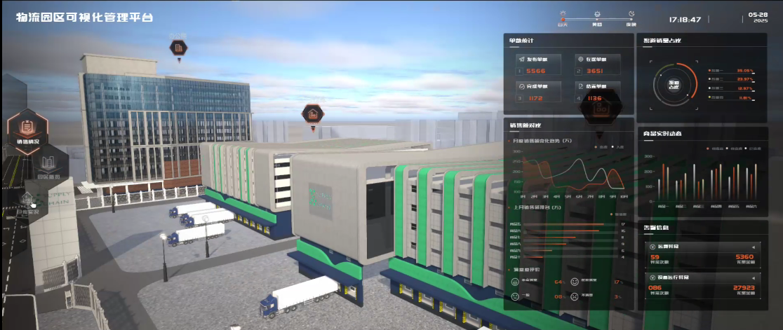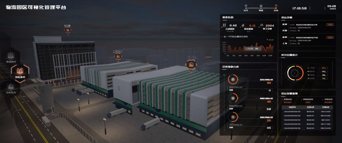 依托数字孪生技术还原园区真实场景,清晰呈现仓储、运输、分拣等核心区域与设施细节,为管理提供真实场景支撑。