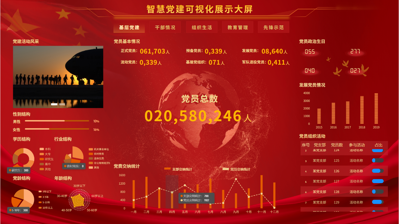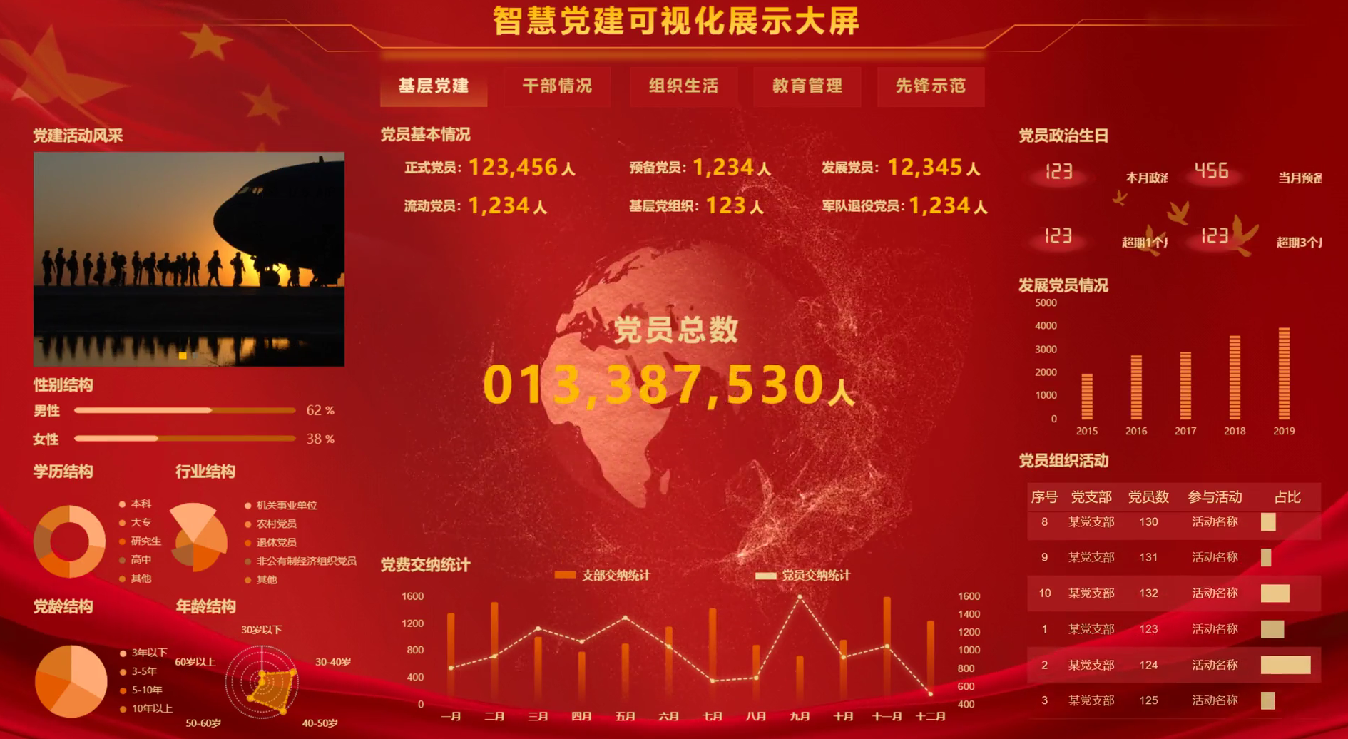 覆盖党组织建设、党员发展、活动开展、考核评价等党建全场景数据,支持多维度数据关联分析,实现党建工作全流程数字化管控。