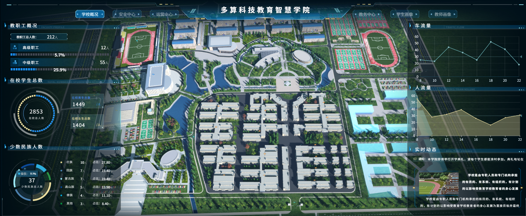 智慧校园可视化面向中小学、高校等各学段教育机构的智慧校园可视化解决方案,以数字孪生、3D 可视化、数据可视化为核心技术支撑,整合教学管理、校园运营、安全监测等多维度数据,构建一体化智能大屏平台。