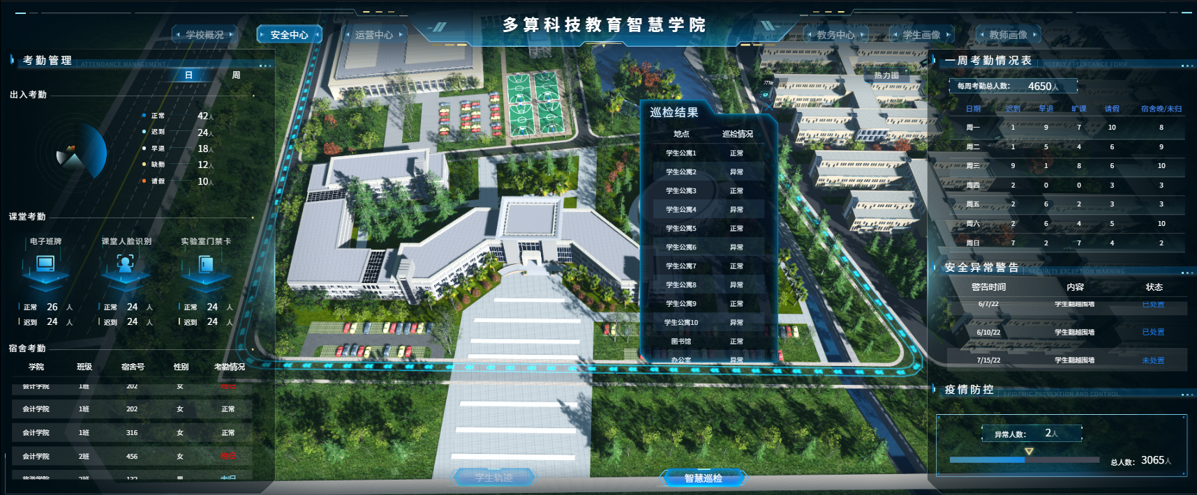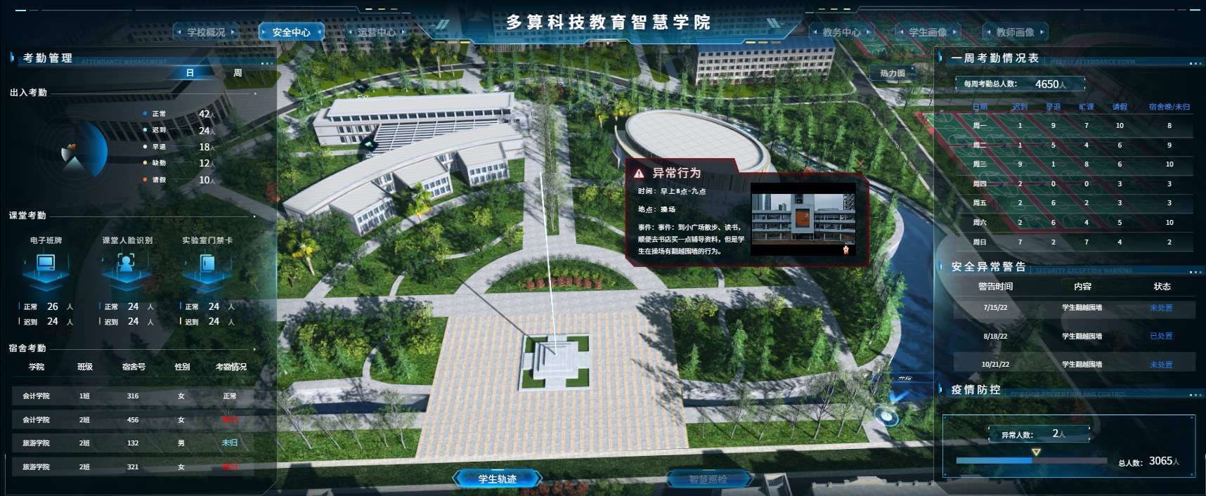 整合教学、运营、安防等多维度数据,管理者无需切换多个系统即可掌握学情趋势、资源使用效率、设备完好率、安防告警、监考动态等核心信息,决策前的数据收集时间从 “天级” 缩短至 “分钟级”,校园管理响应速度与决策精准度显著提升。
