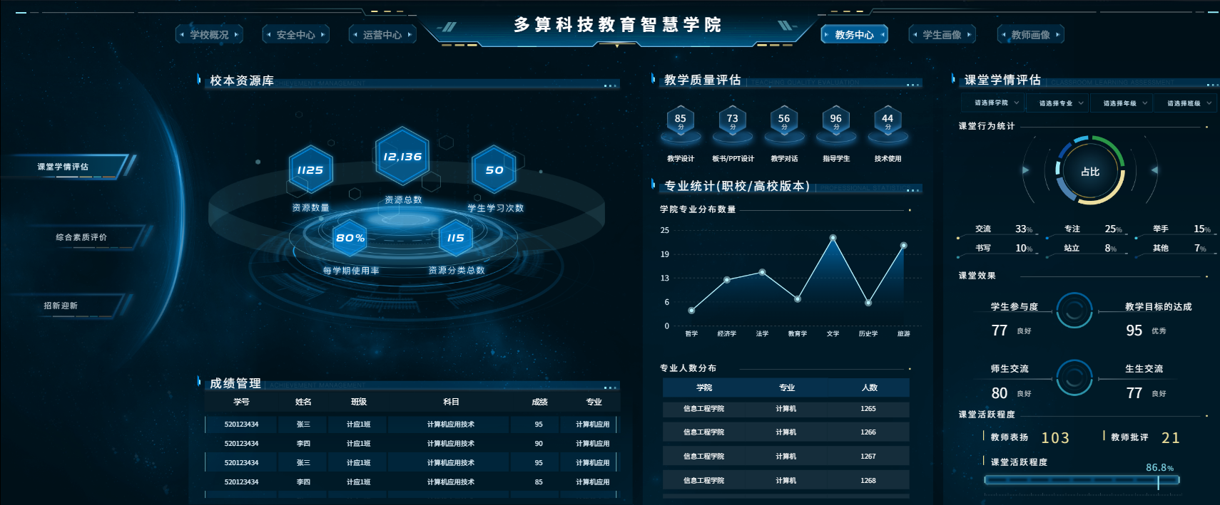 通过实时可视化呈现教室、图书资源、教学设备、师资力量等校园核心资源状态,避免 “教室闲置与紧缺并存”“设备空转与超负荷使用矛盾”“图书资源分配不均” 等问题,提升资源利用率。